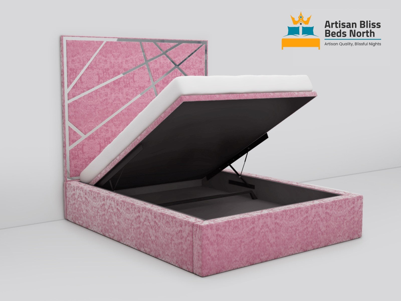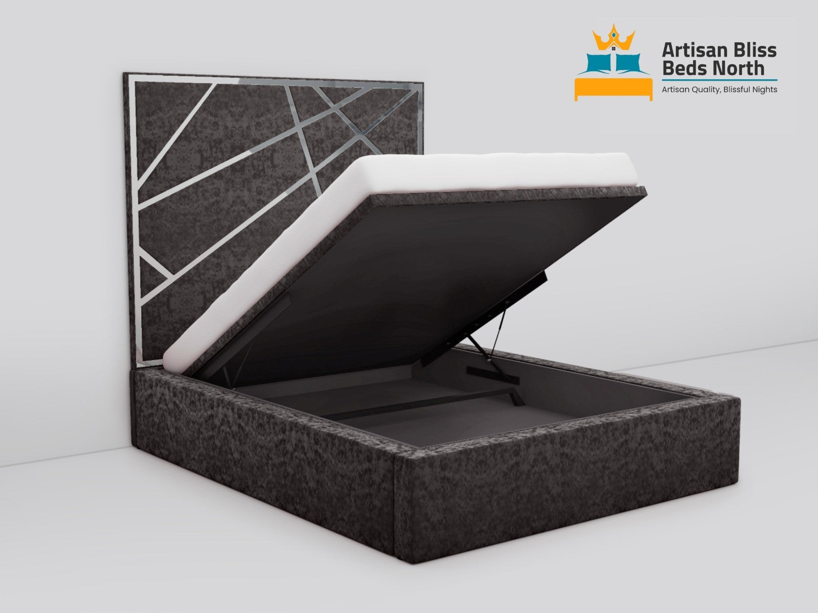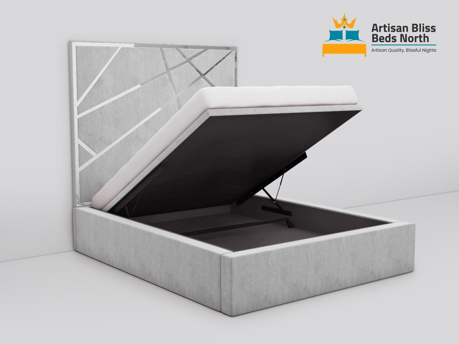 Find modern elegance with the extravagant Angle Aura Storage Bed, created by Artisan Bliss Beds North Limited. This premium bed's distinctive angular headboard design features simple lines and geometric elements that make a strong, modern statement. Rich, premium fabric covers the bed's structural design, which gives any bedroom environment depth, substance, and sophistication.